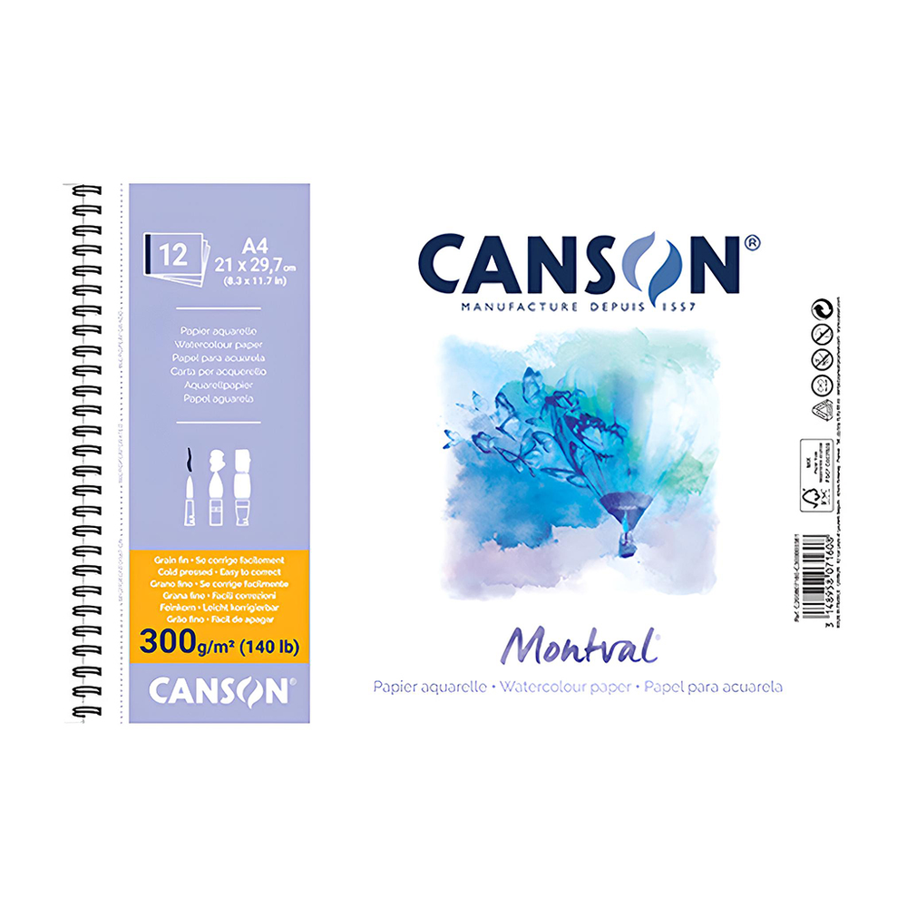 BLOCK ACUARELA A4 CANSON MONTVAL 300GR ESPIRAL 12 HOJAS GRANO FINO